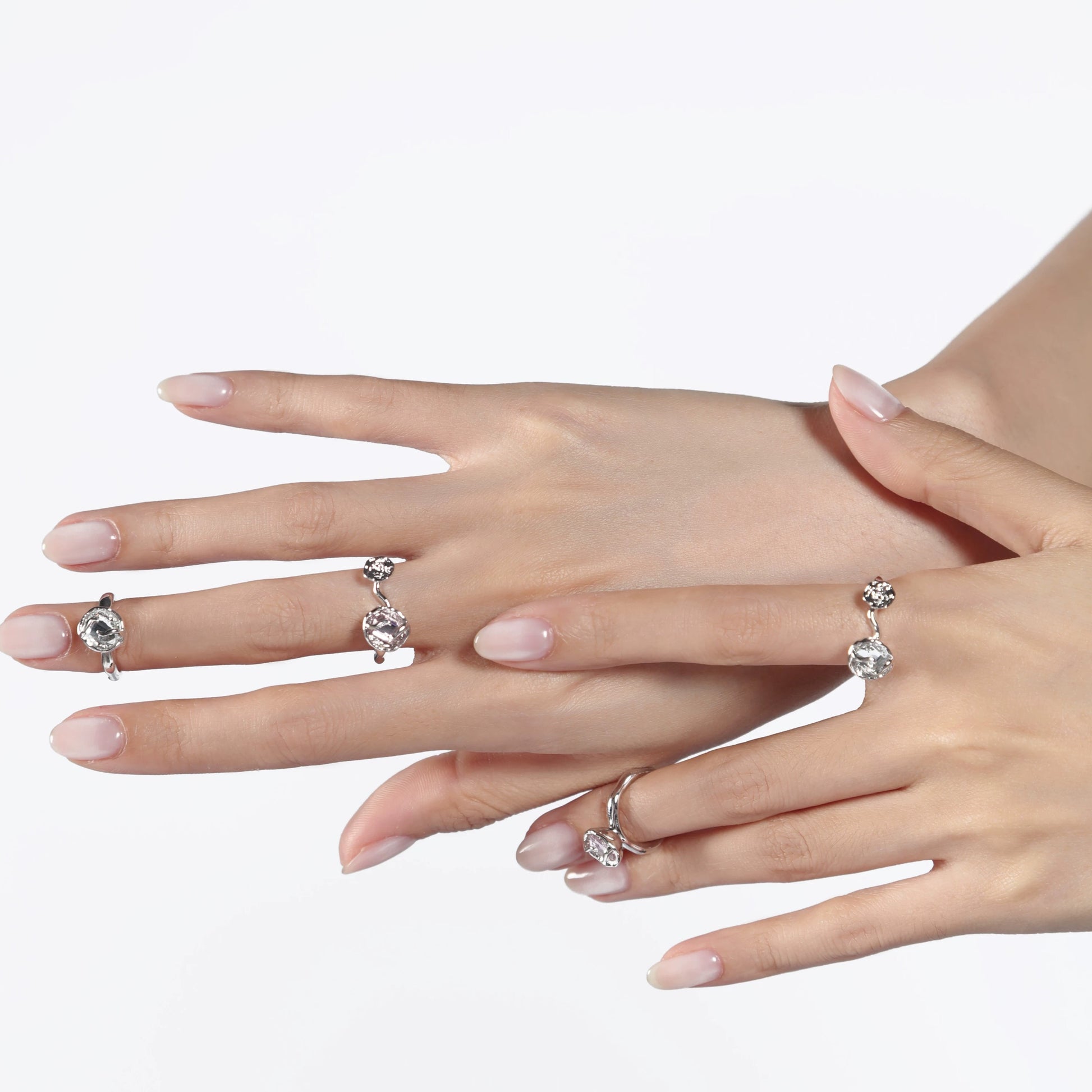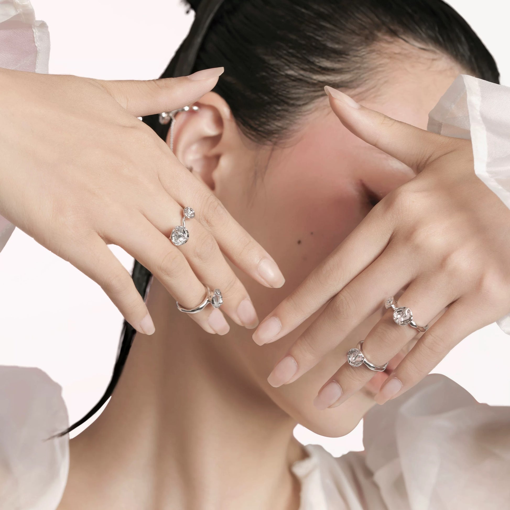 The ring is inspired by the pistil, which is the part of floral blossoms. In the center of each “pistil”, it inlays crystals adding more sparkles into the design.